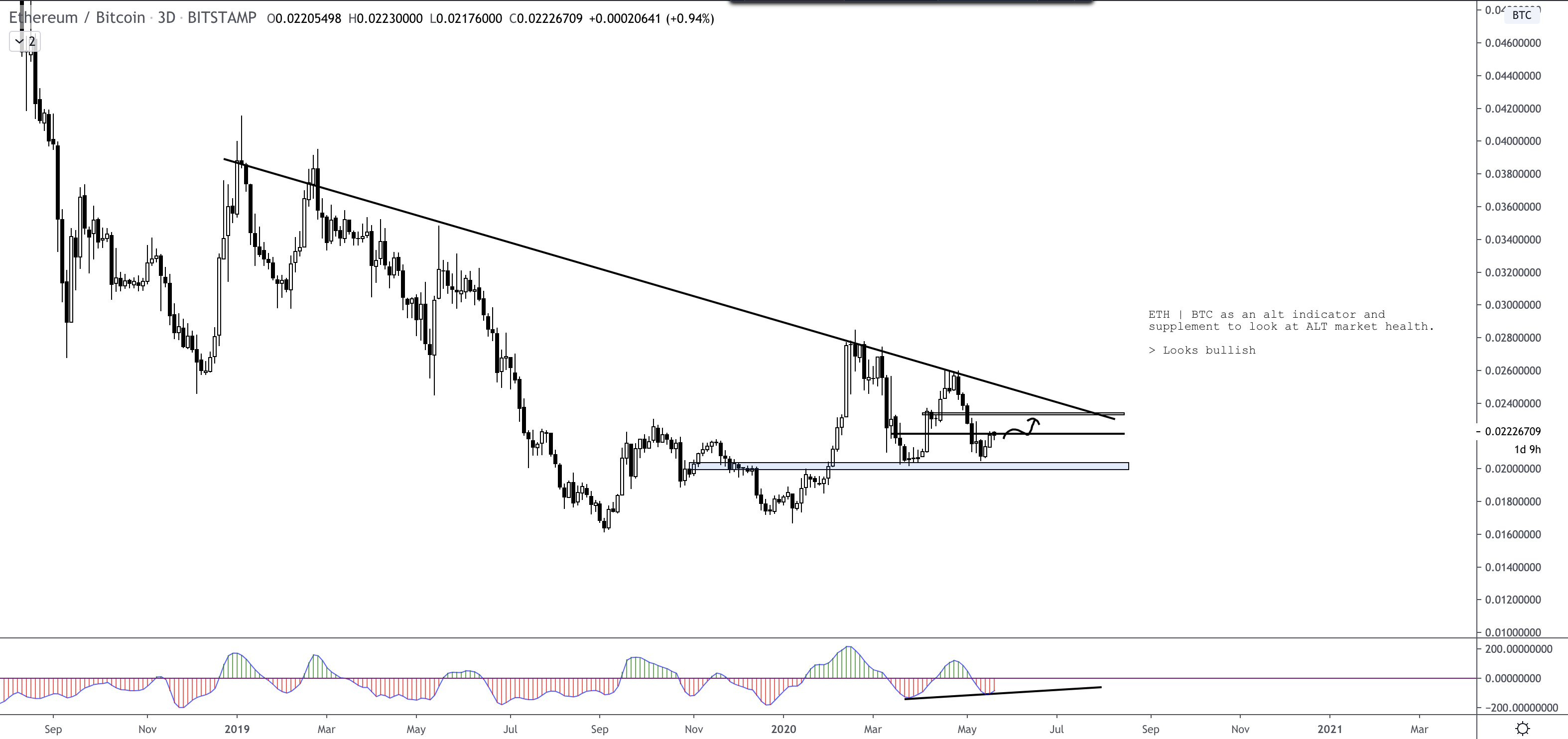 As usual we use the ETH/BTC chart as an indicator of alt strength, and we can see that it too is looking bullish: